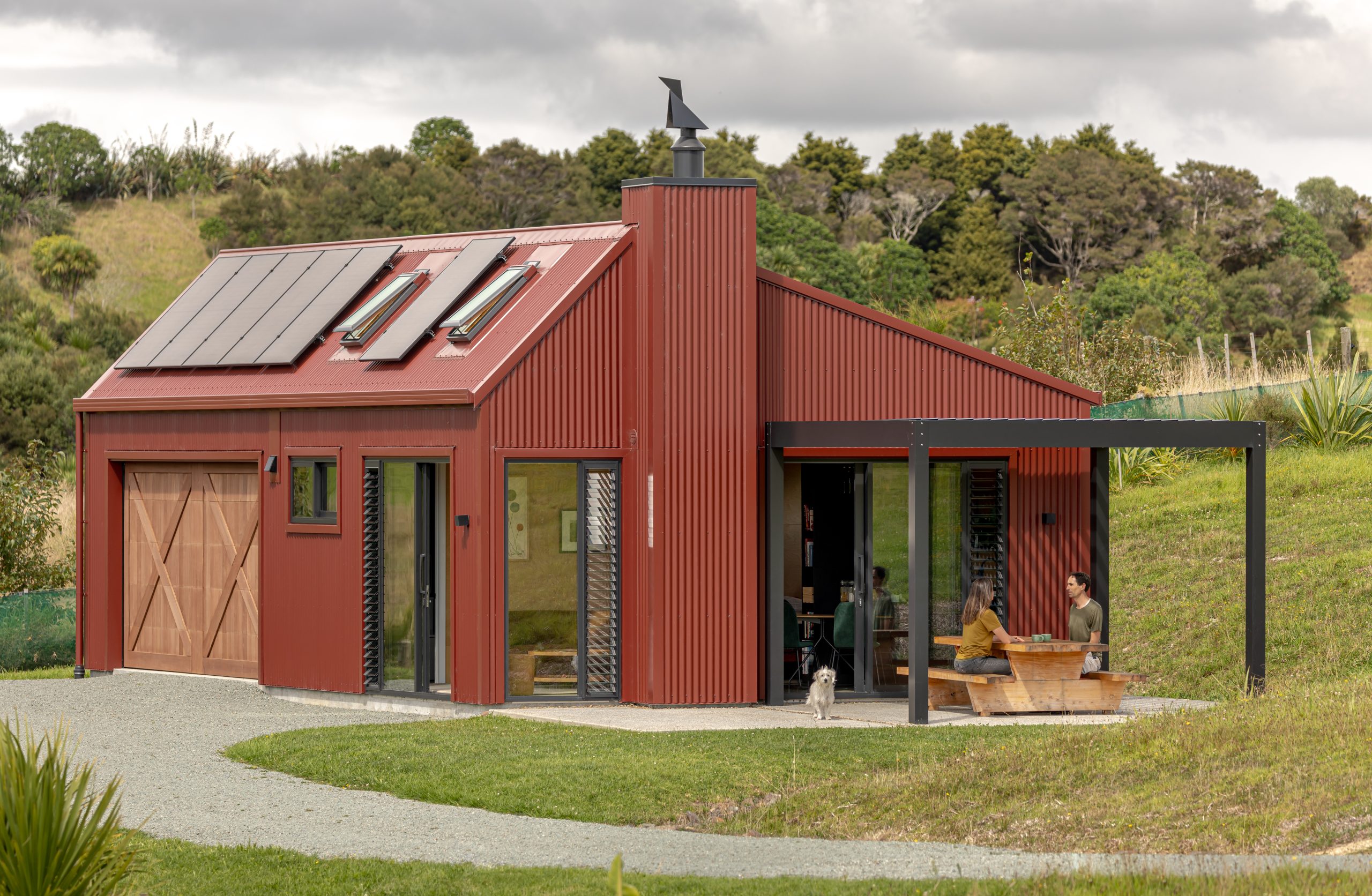The building design features an asymmetrical gabled shape that reflects Christchurch-born Tim’s memories of the historical settlers’ homes and goldminers’ cottages of central Otago, with their simple forms, corrugated iron cladding and chimneys jutting out from one end of the building. The farm shed-style design also harks back to the traditional red barn forms of Madison County, in Iowa, where Sarah’s father lived.